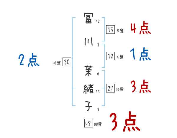 総運![]() | 冨川茉緒子さんの総運は42画の3つ星!病気に注意。多芸であるが消極的でおとなしい。 あなたの人生を表す1番重要な運勢です。生涯を通じて影響する総合運となり、主に50歳以降の晩年期に影響を及ぼします。 |
