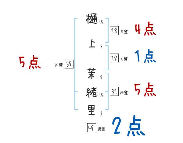 天運![]() | 樋上茉緒里さんの天運は18画の4つ星!情熱的で剛気。忍耐力があり信頼される。 家系が持つ宿命的な運勢を表します。祖先から受け継いだ苗字ですので自分の力が及びません。家柄を象徴します。 |