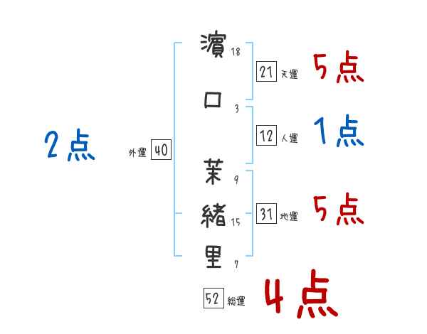 天運![]() | 濵口茉緒里さんの天運は21画の5つ星!統率力がある。独立し成功する。名誉を手に入れる。 家系が持つ宿命的な運勢を表します。祖先から受け継いだ苗字ですので自分の力が及びません。家柄を象徴します。 |