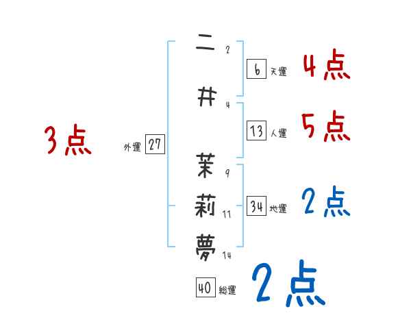 外運![]() | 二井茉莉夢さんの外運は27画の3つ星!頭脳明晰だが強情で摩擦が多い傾向。孤立に注意。 生活面を象徴する運勢です。外部から受ける影響力を表し、結婚運、家庭運や職場、環境への順応性を表します。 |