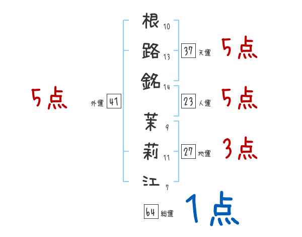 人運![]() | 根路銘茉莉江さんの人運は23画の5つ星!想像力に優れ活力がある。一代で成功し名誉を手に入れる。 性格や才能などを表す2番目に重要な運勢です。人間関係や協調性、社会的な成功に影響します。主に20歳から50歳ぐらいまでの中年期の運勢を表します。 |