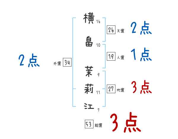 総運![]() | 横畠茉莉江さんの総運は53画の3つ星!やや見栄っ張りで虚栄心がある。散財に注意。 あなたの人生を表す1番重要な運勢です。生涯を通じて影響する総合運となり、主に50歳以降の晩年期に影響を及ぼします。 |