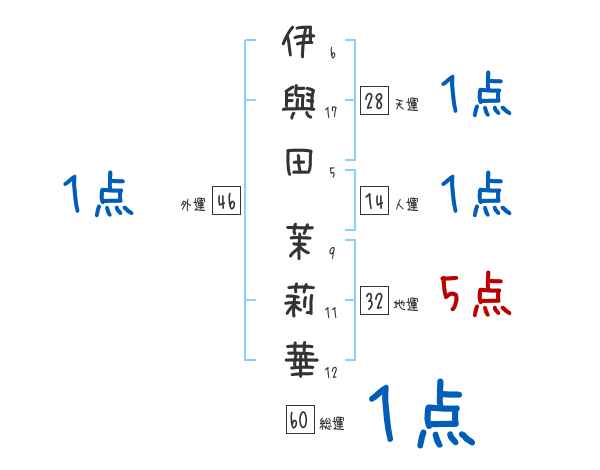 天運![]() | 伊與田茉莉華さんの天運は28画の1つ星!家庭環境に注意。スポーツで活躍できる能力があるかも。 家系が持つ宿命的な運勢を表します。祖先から受け継いだ苗字ですので自分の力が及びません。家柄を象徴します。 |