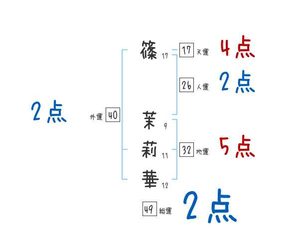 外運![]() | 篠茉莉華さんの外運は40画の2つ星!自信過剰で物事に固執するためトラブルに注意。 生活面を象徴する運勢です。外部から受ける影響力を表し、結婚運、家庭運や職場、環境への順応性を表します。 |