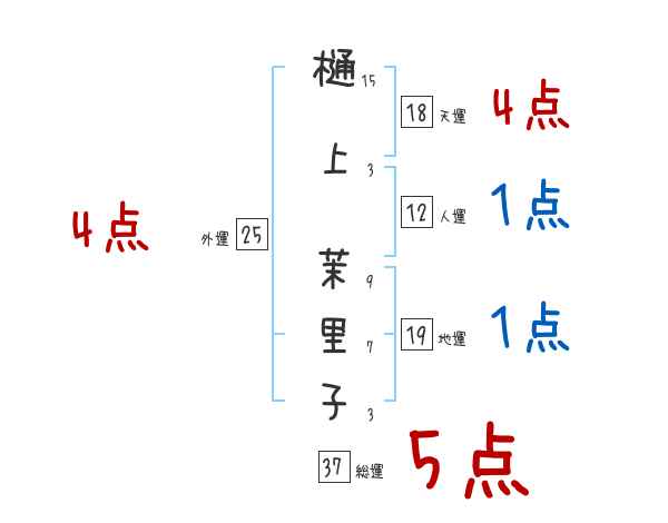 天運![]() | 樋上茉里子さんの天運は18画の4つ星!情熱的で剛気。忍耐力があり信頼される。 家系が持つ宿命的な運勢を表します。祖先から受け継いだ苗字ですので自分の力が及びません。家柄を象徴します。 |