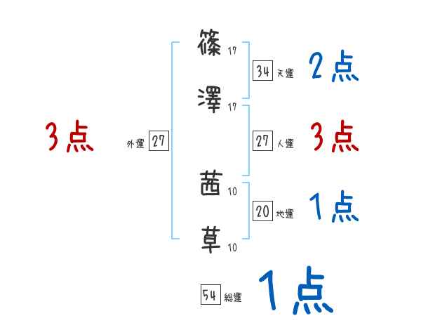 外運![]() | 篠澤茜草さんの外運は27画の3つ星!頭脳明晰だが強情で摩擦が多い傾向。孤立に注意。 生活面を象徴する運勢です。外部から受ける影響力を表し、結婚運、家庭運や職場、環境への順応性を表します。 |