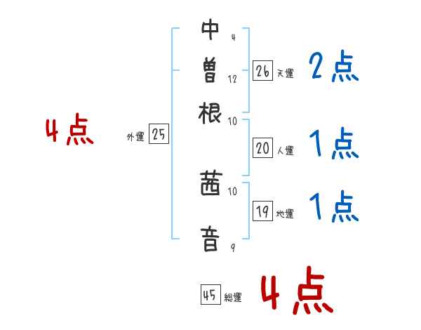 総運![]() | 中曽根茜音さんの総運は45画の4つ星!もくもくと物事を進め達成する。地味な努力家。 あなたの人生を表す1番重要な運勢です。生涯を通じて影響する総合運となり、主に50歳以降の晩年期に影響を及ぼします。 |