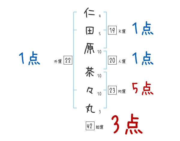 地運![]() | 仁田原茶々丸さんの地運は23画の5つ星!想像力に優れ活力がある。一代で成功し名誉を手に入れる。 個性を表す基礎的な運勢です。性格形成や対人関係、行動力など家庭環境に影響されます。主に誕生してから20歳くらいまでの若年期の運勢を表します。 |