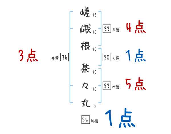 天運![]() | 嵯峨根茶々丸さんの天運は33画の4つ星!権力志向でプライドが高い。勇気があり運を切り開き成功する。 家系が持つ宿命的な運勢を表します。祖先から受け継いだ苗字ですので自分の力が及びません。家柄を象徴します。 |