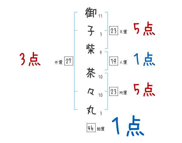 天運![]() | 御子柴茶々丸さんの天運は23画の5つ星!想像力に優れ活力がある。一代で成功し名誉を手に入れる。 家系が持つ宿命的な運勢を表します。祖先から受け継いだ苗字ですので自分の力が及びません。家柄を象徴します。 |