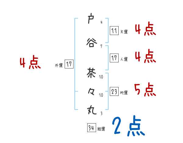 | 総運  | 戸谷茶々丸さんの総運は34画の2つ星!独創性に優れるが、自尊心が強く災難に注意しましょう。あなたの人生を表す1番重要な運勢です。生涯を通じて影響する総合運となり、主に50歳以降の晩年期に影響を及ぼします。 |
