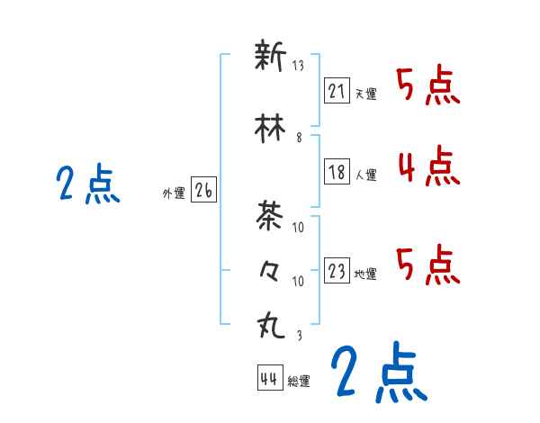 総運![]() | 新林茶々丸さんの総運は44画の2つ星!誠実で慎重な性格。物事を考えすぎないように注意しましょう。 あなたの人生を表す1番重要な運勢です。生涯を通じて影響する総合運となり、主に50歳以降の晩年期に影響を及ぼします。 |