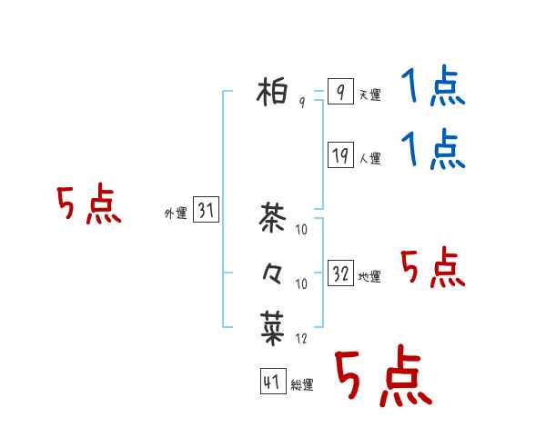天運![]() | 柏茶々菜さんの天運は9画の1つ星!消極的で才能を発揮することが苦手なことも。周りの意見に耳を傾けましょう。 家系が持つ宿命的な運勢を表します。祖先から受け継いだ苗字ですので自分の力が及びません。家柄を象徴します。 |