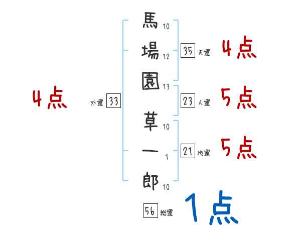 天運![]() | 馬場園草一郎さんの天運は35画の4つ星!温厚な性格で感受性が高い。穏和な性格で人望が厚い。 家系が持つ宿命的な運勢を表します。祖先から受け継いだ苗字ですので自分の力が及びません。家柄を象徴します。 |