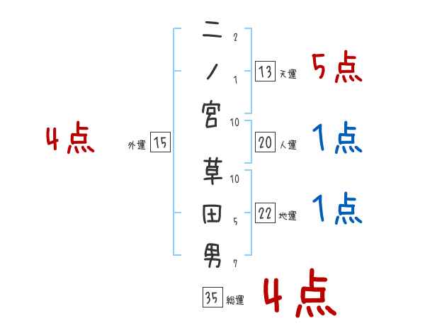 天運![]() | 二ノ宮草田男さんの天運は13画の5つ星!才能に恵まれ人気がある。名声を手に入れる。円満な人生。 家系が持つ宿命的な運勢を表します。祖先から受け継いだ苗字ですので自分の力が及びません。家柄を象徴します。 |