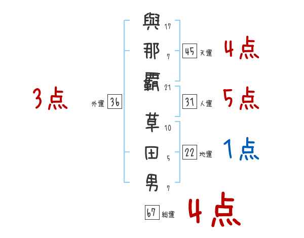 天運![]() | 與那覇草田男さんの天運は45画の4つ星!もくもくと物事を進め達成する。地味な努力家。 家系が持つ宿命的な運勢を表します。祖先から受け継いだ苗字ですので自分の力が及びません。家柄を象徴します。 |