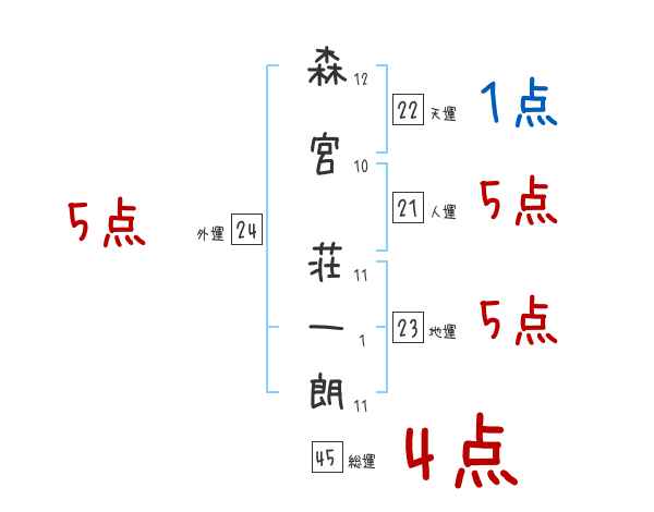 外運![]() | 森宮荘一朗さんの外運は24画の5つ星!家庭運が良く順調な人生。金運にも恵まれる。 生活面を象徴する運勢です。外部から受ける影響力を表し、結婚運、家庭運や職場、環境への順応性を表します。 |