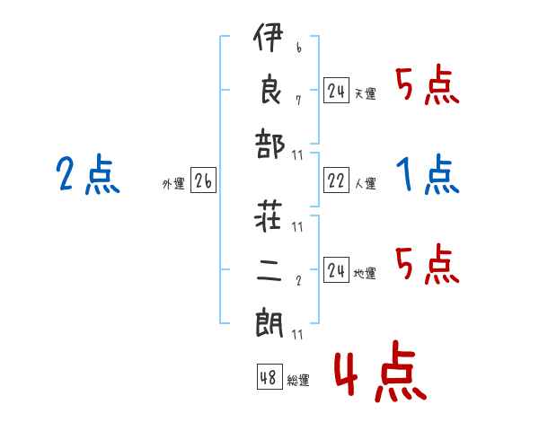 天運![]() | 伊良部荘二朗さんの天運は24画の5つ星!家庭運が良く順調な人生。金運にも恵まれる。 家系が持つ宿命的な運勢を表します。祖先から受け継いだ苗字ですので自分の力が及びません。家柄を象徴します。 |