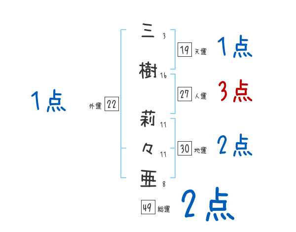 外運![]() | 三樹莉々亜さんの外運は22画の1つ星!努力することが苦手ないっぽう手先が器用。芸術性にも優れる。 生活面を象徴する運勢です。外部から受ける影響力を表し、結婚運、家庭運や職場、環境への順応性を表します。 |
