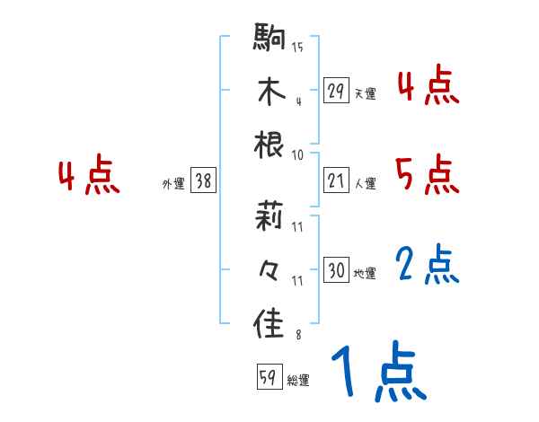 天運![]() | 駒木根莉々佳さんの天運は29画の4つ星!完全主義で才能がある。厳格な心の持ち主。 家系が持つ宿命的な運勢を表します。祖先から受け継いだ苗字ですので自分の力が及びません。家柄を象徴します。 |