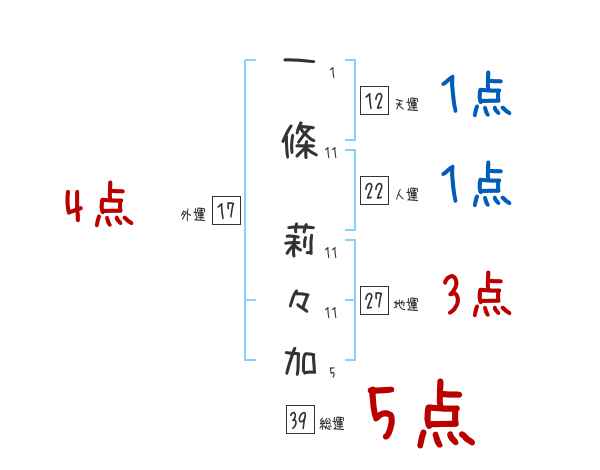 天運![]() | 一條莉々加さんの天運は12画の1つ星!簡単な失敗で諦めてしまいやすいかも。着実に行動すると良いでしょう。 家系が持つ宿命的な運勢を表します。祖先から受け継いだ苗字ですので自分の力が及びません。家柄を象徴します。 |