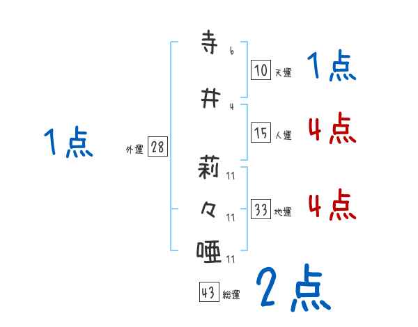 外運![]() | 寺井莉々唖さんの外運は28画の1つ星!家庭環境に注意。スポーツで活躍できる能力があるかも。 生活面を象徴する運勢です。外部から受ける影響力を表し、結婚運、家庭運や職場、環境への順応性を表します。 |