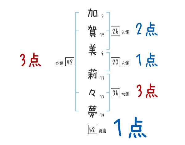 天運![]() | 加賀美莉々夢さんの天運は26画の2つ星!波瀾万丈かも。信頼できる人を大事にしましょう。 家系が持つ宿命的な運勢を表します。祖先から受け継いだ苗字ですので自分の力が及びません。家柄を象徴します。 |