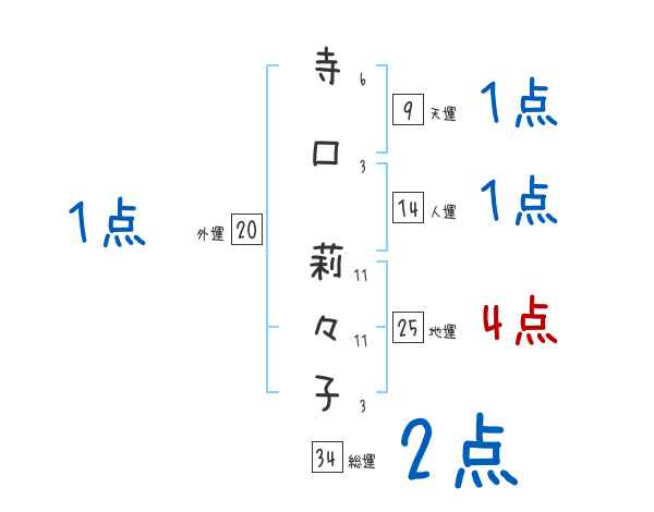 天運![]() | 寺口莉々子さんの天運は9画の1つ星!消極的で才能を発揮することが苦手なことも。周りの意見に耳を傾けましょう。 家系が持つ宿命的な運勢を表します。祖先から受け継いだ苗字ですので自分の力が及びません。家柄を象徴します。 |