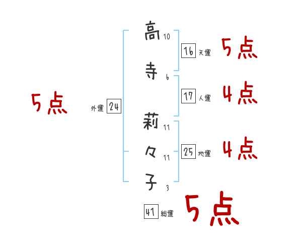外運![]() | 高寺莉々子さんの外運は24画の5つ星!家庭運が良く順調な人生。金運にも恵まれる。 生活面を象徴する運勢です。外部から受ける影響力を表し、結婚運、家庭運や職場、環境への順応性を表します。 |