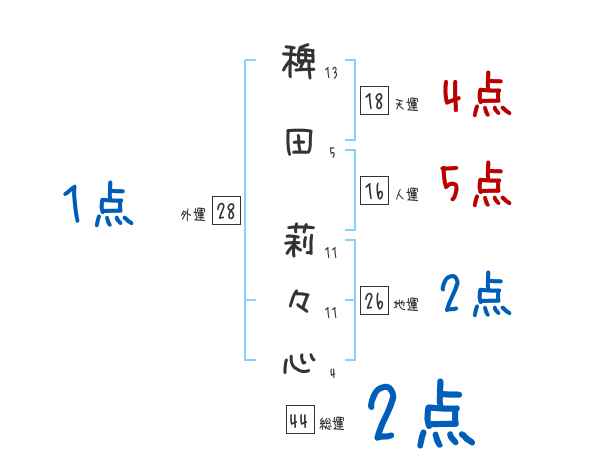 天運![]() | 稗田莉々心さんの天運は18画の4つ星!情熱的で剛気。忍耐力があり信頼される。 家系が持つ宿命的な運勢を表します。祖先から受け継いだ苗字ですので自分の力が及びません。家柄を象徴します。 |