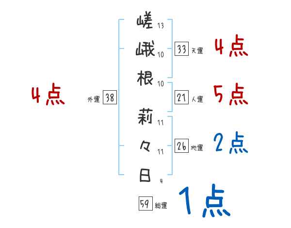 外運![]() | 嵯峨根莉々日さんの外運は38画の4つ星!温厚な性格で技術的な才能を発揮する。職人的な仕事に向いている。 生活面を象徴する運勢です。外部から受ける影響力を表し、結婚運、家庭運や職場、環境への順応性を表します。 |