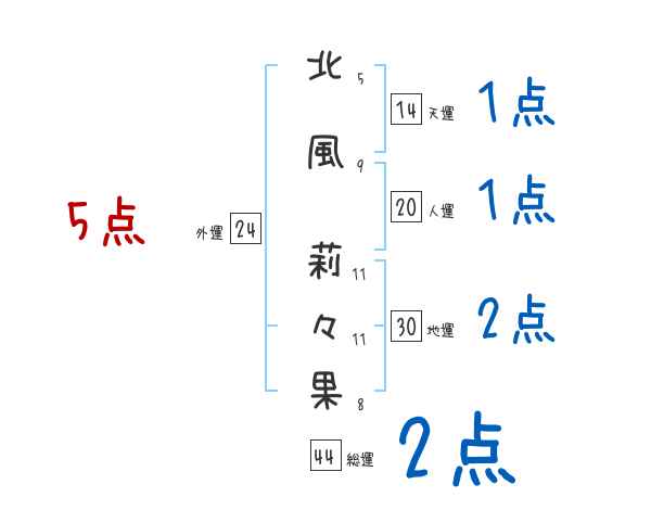 総運![]() | 北風莉々果さんの総運は44画の2つ星!誠実で慎重な性格。物事を考えすぎないように注意しましょう。 あなたの人生を表す1番重要な運勢です。生涯を通じて影響する総合運となり、主に50歳以降の晩年期に影響を及ぼします。 |