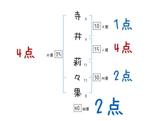 天運![]() | 寺井莉々果さんの天運は10画の1つ星!不安を感じやすい傾向。ストレスを抱えないように注意しましょう。 家系が持つ宿命的な運勢を表します。祖先から受け継いだ苗字ですので自分の力が及びません。家柄を象徴します。 |