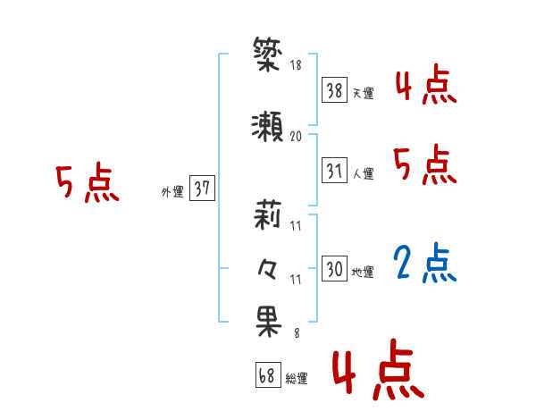 総運![]() | 簗瀬莉々果さんの総運は68画の4つ星!潜在能力が高く集中力が高い。勤勉に励み発展する。 あなたの人生を表す1番重要な運勢です。生涯を通じて影響する総合運となり、主に50歳以降の晩年期に影響を及ぼします。 |