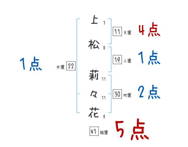 天運![]() | 上松莉々花さんの天運は11画の4つ星!着実に富や地位を得る幸運な人生。 家系が持つ宿命的な運勢を表します。祖先から受け継いだ苗字ですので自分の力が及びません。家柄を象徴します。 |