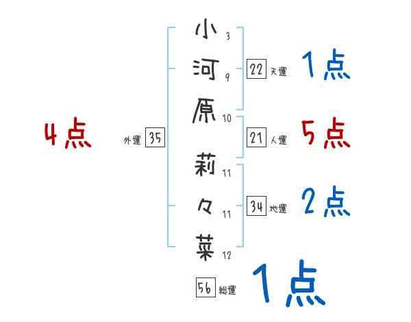 外運![]() | 小河原莉々菜さんの外運は35画の4つ星!温厚な性格で感受性が高い。穏和な性格で人望が厚い。 生活面を象徴する運勢です。外部から受ける影響力を表し、結婚運、家庭運や職場、環境への順応性を表します。 |