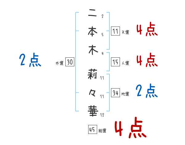 総運![]() | 二本木莉々華さんの総運は45画の4つ星!もくもくと物事を進め達成する。地味な努力家。 あなたの人生を表す1番重要な運勢です。生涯を通じて影響する総合運となり、主に50歳以降の晩年期に影響を及ぼします。 |