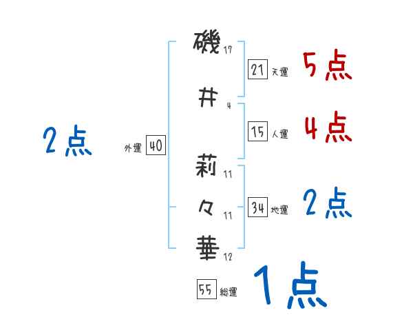 外運![]() | 磯井莉々華さんの外運は40画の2つ星!自信過剰で物事に固執するためトラブルに注意。 生活面を象徴する運勢です。外部から受ける影響力を表し、結婚運、家庭運や職場、環境への順応性を表します。 |
