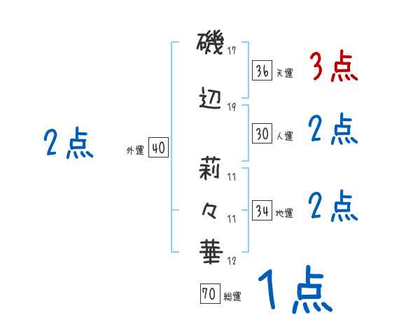 人運![]() | 磯辺莉々華さんの人運は30画の2つ星!浮き沈みの激しさに注意しましょう。 性格や才能などを表す2番目に重要な運勢です。人間関係や協調性、社会的な成功に影響します。主に20歳から50歳ぐらいまでの中年期の運勢を表します。 |