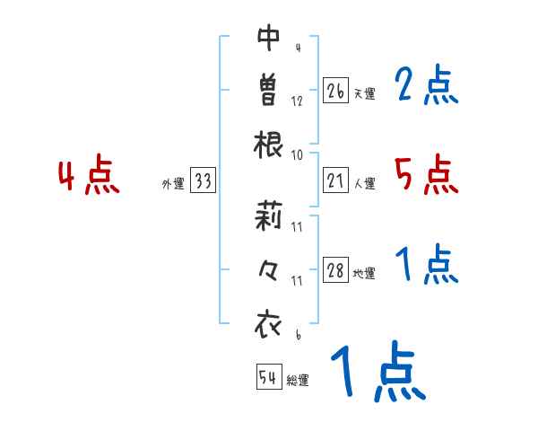 外運![]() | 中曽根莉々衣さんの外運は33画の4つ星!権力志向でプライドが高い。勇気があり運を切り開き成功する。 生活面を象徴する運勢です。外部から受ける影響力を表し、結婚運、家庭運や職場、環境への順応性を表します。 |