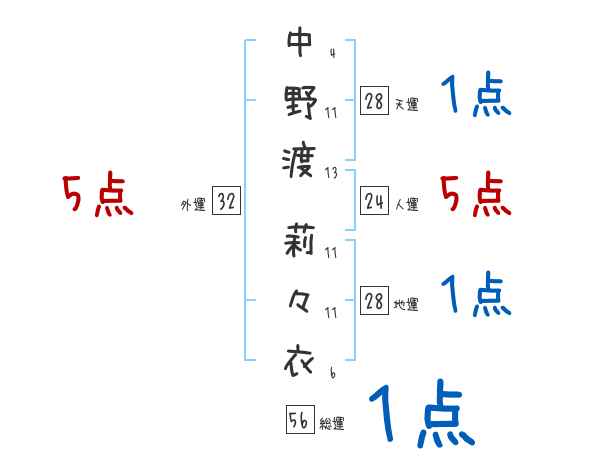 外運![]() | 中野渡莉々衣さんの外運は32画の5つ星!柔軟性があり成功する。チャンスが多く金運が良い。 生活面を象徴する運勢です。外部から受ける影響力を表し、結婚運、家庭運や職場、環境への順応性を表します。 |