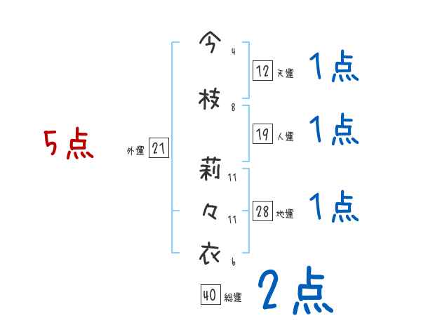 天運![]() | 今枝莉々衣さんの天運は12画の1つ星!簡単な失敗で諦めてしまいやすいかも。着実に行動すると良いでしょう。 家系が持つ宿命的な運勢を表します。祖先から受け継いだ苗字ですので自分の力が及びません。家柄を象徴します。 |