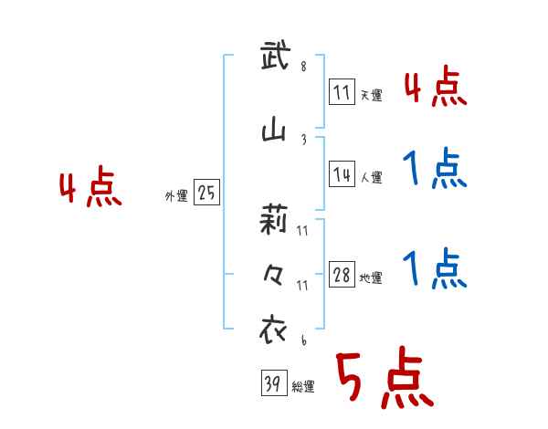総運![]() | 武山莉々衣さんの総運は39画の5つ星!社交性に優れ人望が厚い。人の上に立ち成功する。 あなたの人生を表す1番重要な運勢です。生涯を通じて影響する総合運となり、主に50歳以降の晩年期に影響を及ぼします。 |