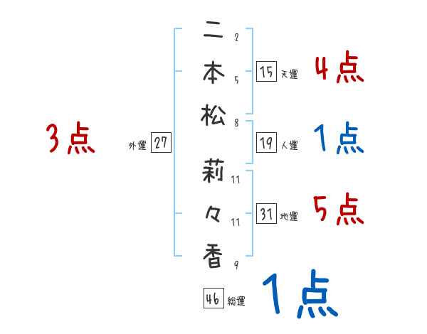 外運![]() | 二本松莉々香さんの外運は27画の3つ星!頭脳明晰だが強情で摩擦が多い傾向。孤立に注意。 生活面を象徴する運勢です。外部から受ける影響力を表し、結婚運、家庭運や職場、環境への順応性を表します。 |