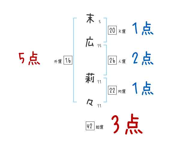 外運![]() | 末広莉々さんの外運は16画の5つ星!人望が厚く大きく発展する。逆転成功が見える。 生活面を象徴する運勢です。外部から受ける影響力を表し、結婚運、家庭運や職場、環境への順応性を表します。 |