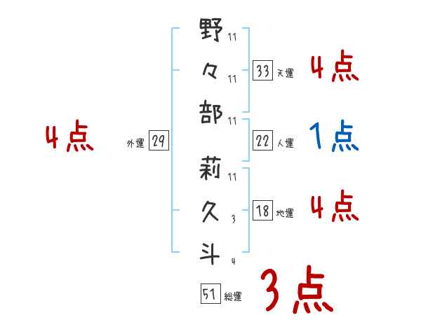 外運![]() | 野々部莉久斗さんの外運は29画の4つ星!完全主義で才能がある。厳格な心の持ち主。 生活面を象徴する運勢です。外部から受ける影響力を表し、結婚運、家庭運や職場、環境への順応性を表します。 |
