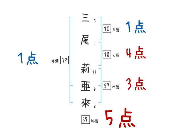 総運![]() | 三尾莉亜來さんの総運は37画の5つ星!努力家で順応性に優れる。現実的な考え方ができ忠実に物事をこなす。 あなたの人生を表す1番重要な運勢です。生涯を通じて影響する総合運となり、主に50歳以降の晩年期に影響を及ぼします。 |