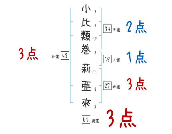 天運![]() | 小比類巻莉亜來さんの天運は34画の2つ星!独創性に優れるが、自尊心が強く災難に注意しましょう。 家系が持つ宿命的な運勢を表します。祖先から受け継いだ苗字ですので自分の力が及びません。家柄を象徴します。 |