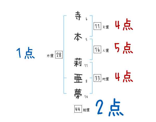 天運![]() | 寺本莉亜夢さんの天運は11画の4つ星!着実に富や地位を得る幸運な人生。 家系が持つ宿命的な運勢を表します。祖先から受け継いだ苗字ですので自分の力が及びません。家柄を象徴します。 |