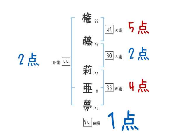 天運![]() | 権藤莉亜夢さんの天運は41画の5つ星!大志を抱き、目標に向かって実力を発揮し達成する。温和な性格。 家系が持つ宿命的な運勢を表します。祖先から受け継いだ苗字ですので自分の力が及びません。家柄を象徴します。 |
